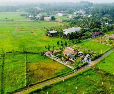 Khu đất đã xây dựng sẵn 1 nhà sàn mái lá trên ao cá,một nhà ở kiên cố ,nhà wc đầy đủ.